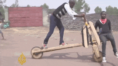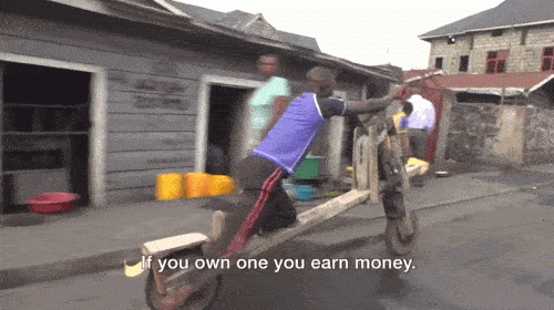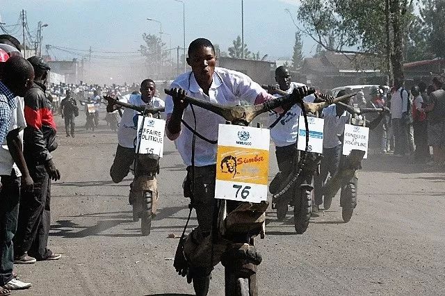 在非洲剛果的戈馬,市中心最具風采的街景就是那些騎著木頭踏板自行車風馳電掣的年輕人。