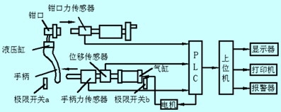 當(dāng)按下啟動按鈕后整個測試過程由plc控制自動進(jìn)行,氣動執(zhí)行機構(gòu)推動摩托車制動圈(輪轂剎車圈手柄進(jìn)行模擬制動,同時手柄力及鉗口力傳感器、手柄位移傳感器獲得的檢測模擬信號傳輸?shù)絧lc的模擬模塊,plc通過rs485/232接口與上位機通信,plc把傳感器的模擬信號轉(zhuǎn)換成數(shù)字信號傳輸?shù)缴衔粰C,顯示器上分別顯示手柄力及鉗口力的大小和手柄位移等參數(shù)和對應(yīng)的曲線,當(dāng)設(shè)定電機運行時間結(jié)束時電機停止且反轉(zhuǎn)使氣動執(zhí)行機構(gòu)復(fù)位,極限開關(guān)起限位保護(hù)作用,當(dāng)氣動執(zhí)行機構(gòu)推動手柄與極限開關(guān)接觸時,電機自動停止,若有檢測結(jié)果超出設(shè)定合格值,報警器會及時報警。